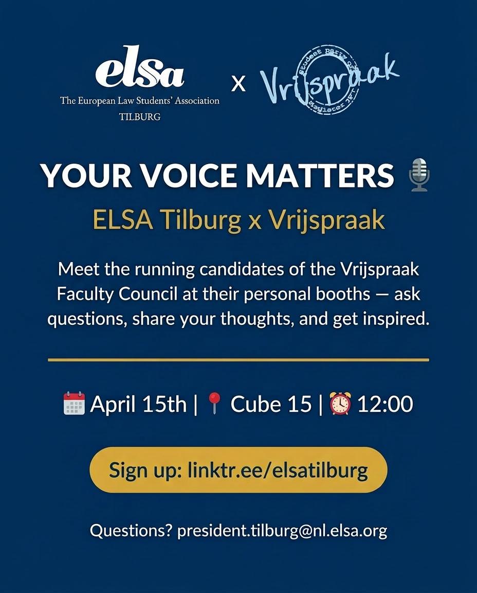 12:00 pm - 1:30 pm Afternoon with Vrijspraak Faculty Council Candidates! April 15 @ 12:00 pm - 1:30 pm Afternoon with Vrijspraak Faculty Council Candidates! Inclusivity and making every voice in Tilburg Law School heard: that’s what Vrijspraak stands for 📣 Join ELSA Tilburg x Vrijspraak on the 15th April for an interactive afternoon with the running candidates of the Vrijspraak Faculty Council! Curious about what Vrijspraak does or thinking about getting involved in university politics? This is your chance … Continue reading "Afternoon with Vrijspraak Faculty Council Candidates!"